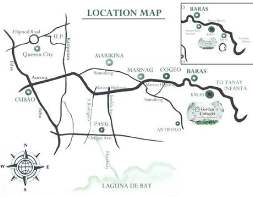 The entrance is located at the right side of the Marcos Highway road after the Garden Cottages, Foremost Farms and Palo Alto markers in Baras, Rizal, if coming from Metro Manila. Take note to only take Marcos Highway and avoid the Manila-East Road if coming from Metro Manila. The latter is a significantly longer and less reliable route. Distance based on the recommended route is provided below: